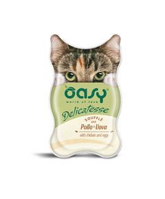 Oasy Delicatesse Souffle Chicken & Eggs (κοτόπουλο & αυγά σουφλέ) 85gr.Κρεμώδης πλήρης υγρή τροφή με κοτόπουλο και αυγά, ιδανική για γάτες που αγαπούν την απαλή και λεπτή σύσταση. Λεπτή υφή σουφλέ και απαλή καρδιά από κομμάτια για ένα νόστιμο και θρεπτικό γεύμα! ΣΥΝΘΕΣΗ: κρέας και ζωικά...
