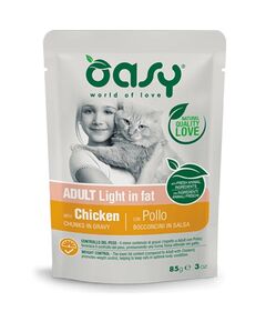 Τροφή γάτας φακελάκι OASY ADULT LIGHT IN FAT chicken 85gr  Τα Oasy Φακελάκια σε σάλτσα είναι μια σειρά από πλήρης τροφή για γάτες που παρασκευάζεται με φρέσκο κρέας και φυσικά συστατικά για υψηλή γευστικότητα και κάλυψη κάθε ιδιαίτερης ανάγκης της γάτας σας. Διαθέσιμη σε 8 νόστιμες...