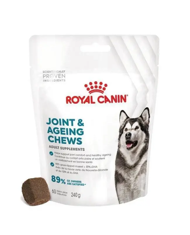 Κατάλληλα για ενήλικους σκύλους, τα μασώμενα συμπληρώματα Joint & Ageing Adult της ROYAL CANIN® σχεδιάζονται από κτηνιάτρους και εγκρίνονται από τους ίδιους του σκύλους. Αυτά τα συμπληρώματα είναι ειδικά σχεδιασμένα με ένα επιστημονικά μελετημένο μείγμα συστατικών, που βασίζεται σε περισσότερα από 50 χρόνια έρευνας και παρατήρησης στη διατροφή των σκύλων. Τα μασώμενα συμπληρώματα Joint & Ageing Adult της ROYAL CANIN® είναι σχεδιασμένα για να υποστηρίζουν τις αρθρώσεις του σκύλου σας και να προάγουν την υγιή γήρανση. Αυτά τα μασώμενα συμπληρώματα περιλαμβάνουν μύδια με πράσινο χείλος (GLM) για τη διατήρηση της υγείας των χόνδρων, καθώς και EPA και DHA – ωμέγα-3 λιπαρά οξέα που βοηθούν στην υποστήριξη της λειτουργίας των αρθρώσεων. Περιέχουν επίσης σκόνη τομάτας (πηγή λυκοπενίου), καθώς και βιταμίνες C και Ε για την υποστήριξη της υγιούς γήρανσης.