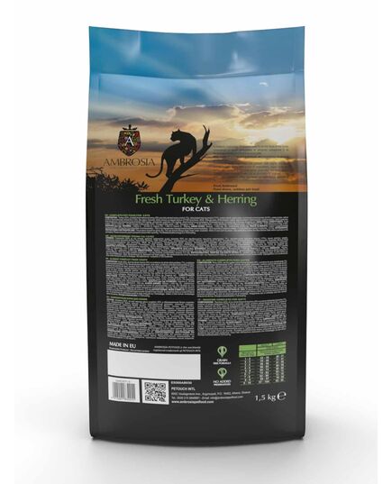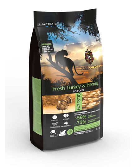 Η συνταγή μας «Ambrosia με φρέσκια γαλοπούλα και ρέγγα» συνδυάζει φιλέτα φρέσκιας γαλοπούλας πλούσιας σε πρωτεΐνες μαζί με ρέγγα πλούσια σε ωμέγα-3, με επιλεγμένα φρούτα και λαχανικά. Αυτή η συνταγή έχει διαμορφωθεί για στειρωμένες γάτες χαμηλής δραστηριότητας που μένουν σε εσωτερικούς χώρους καθώς έχει χαμηλή ποσότητα λιπαρών (για να εμποδίσει τη συσσώρευση περιττού βάρους), περιέχει DL- μεθιονίνη και χαμηλή ποσότητα μαγνησίου (για να εμποδίσει τον σχηματισμό πετρών στρουβίτη). Επίσης περιέχει πρεβιοτικά και προβιοτικά (για να βελτιώσει την πέψη και το ανοσοποιητικό σύστημα), χονδροϊτίνη και γλυκοζαμίνη (για να προστατέψει τις αρθρώσεις) και ταυρίνη (για να ενισχύσει την ανάπτυξη του εγκεφάλου, το καρδιαγγειακό και το μυϊκό σύστημα).