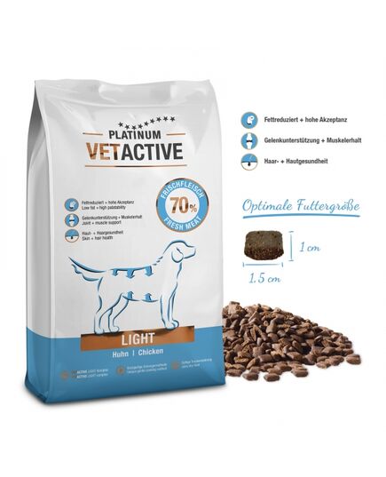 Πολλοί τετράποδοι φίλοι στις μέρες μας υποφέρουν από παχυσαρκία ή προβλήματα με το πάγκρεας. Ως αποτέλεσμα, όχι μόνο έχουν μικρότερο προσδόκιμο ζωής, αλλά και η ποιότητα ζωής τους περιορίζεται σοβαρά από τη μειωμένη κινητικότητα και πιθανές δευτερογενείς ασθένειες όπως ο σακχαρώδης διαβήτης, οι καρδιαγγειακές παθήσεις και τα προβλήματα των αρθρώσεων. Με το PLATINUM VET ACTIVE Light, ο σκύλος σας έχει μια ισορροπημένη διατροφή που είναι εύκολη για το πάγκρεας και προσφέρει μια πλήρη γευστική εμπειρία. Υψηλής ποιότητας συστατικά και μειωμένη περιεκτικότητα σε ενέργεια και λίπος βοηθούν τον σκύλο σας να μειώσει ή να διατηρήσει το βάρος του.Τα πλεονεκτήματα με μια ματιά: