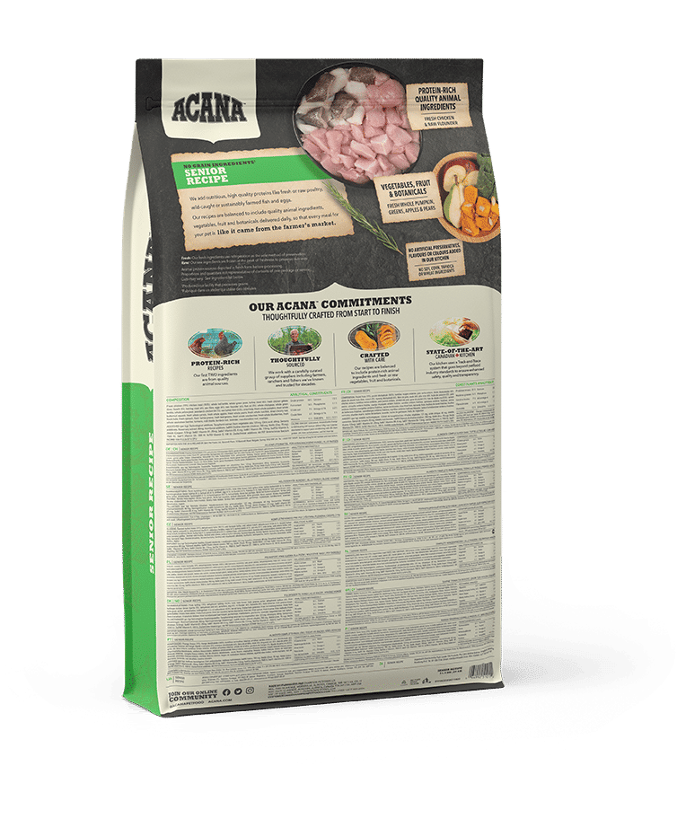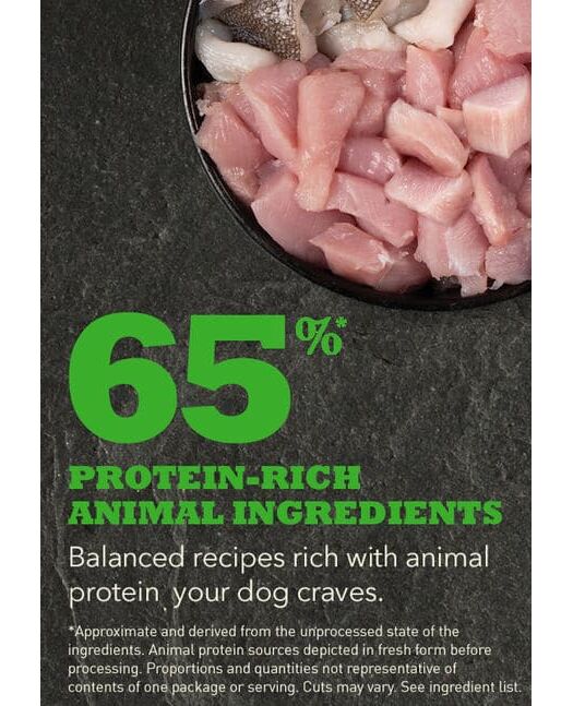 Φρέσκο Κοτόπουλο (19%), Αφυδατωμένο Κοτόπουλο (18%), Ολόκληρες Κόκκινες Φακές, Ολόκληρος Πράσινος Αρακάς, Αφυδατωμένη Γαλοπούλα (6%), Ολόκληρα Ρεβίθια, Φρέσκα Εντόσθια Κοτόπουλου (συκώτι, καρδιά) (5%), Ίνες από Φακές, Φρέσκα Αυγά (4%), Ωμός Μπακαλιάρος (4%), Ιχθυέλαιο (4%), Αφυδατωμένη Ρέγγα (3%), Ολόκληρες Πράσινες Φακές, Ολόκληρος Κίτρινος Αρακάς, Άμυλο Αρακά, Λίπος Κοτόπουλου (1%), Ωμό Συκώτι Γαλοπούλας (1%), Αποξηραμένα Φύκια, Φρέσκια Ολόκληρη Κολοκύθα, Φρέσκια Ολόκληρη Κίτρινη Κολοκύθα, Φρέσκα Ολόκληρα Καρότα, Φρέσκα Ολόκληρα Μήλα, Φρέσκα Ολόκληρα Αχλάδια, Φρέσκο Ολόκληρο Κολοκύθι, Αποξηραμένη Ρίζα Πικραλίδας, Φρέσκο Kale, Φρέσκο Σπανάκι, Φρέσκα Φύλλα Γογγυλιού, Φρέσκα Φύλλα Παντζαριού, Ολόκληρα Κράνμπερι, Ολόκληρα Μύρτιλα, Ολόκληρα Μούρα Saskatoon, Κουρκουμάς, Γαϊδουράγκαθο, Ρίζα Λάππας, Λεβάντα, Ρίζα Μολόχας, Καρποί Τριανταφυλλιάς.