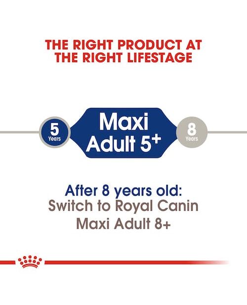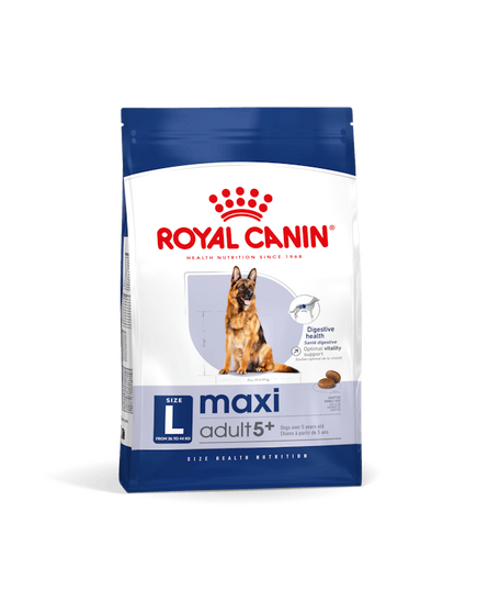 Η γήρανση στους σκύλους μπορεί να ποικίλει, αλλά όταν ο μεγαλόσωμος σκύλος σας φτάσει την ηλικία των 5 περίπου ετών, τα πρώτα σημάδια γήρανσης μπορεί να αρχίσουν να εμφανίζονται. Γι 'αυτό είναι σημαντικό να θυμάστε ότι σε κάθε στάδιο της ζωής του σκύλου σας, μια ισορροπημένη διατροφή είναι σημαντική για την υποστήριξη της καλής υγείας του. Η τροφή για σκύλους ROYAL CANIN® Maxi Adult 5+ συνταγογραφείται σύμφωνα με τις διατροφικές ανάγκες του μεσήλικα σκυλιού σας και είναι κατάλληλη για μεγαλόσωμους ηλικίας 5 ετών και άνω, με βάρος ενηλίκου που κυμαίνεται από 26kg έως 44kg. Οι μεγαλόσωμοι σκύλοι μπορεί να είναι ευαίσθητοι στην αύξηση του σωματικού βάρους σε αυτό το στάδιο, καθιστώντας ακόμα πιο σημαντικό να παρακολουθείται η ημερήσια ποσότητα πρόσληψης του σκύλου σας και να αποτρέπεται η υπερκατανάλωση τροφής. Το ROYAL CANIN® Maxi Adult 5+ περιέχει ένα μοναδικό και ισορροπημένο μείγμα πρωτεϊνών και διαιτητικών ινών πολύ υψηλής ποιότητας, που σημαίνει ότι κάθε μερίδα δίνει στον σκύλο σας ό, τι χρειάζεται για να διατηρεί ένα υγιές βάρος και να υποστηρίζει τη βέλτιστη πέψη. Το ROYAL CANIN® Maxi Adult 5+ είναι ειδικά σχεδιασμένο για να υποστηρίξει τη στήριξη των μεγαλόσωμων φυλών σκύλων σε αυτό το στάδιο της ζωής, υποστηρίζοντας τα οστά τους, τους συνδέσμους και τις αρθρώσεις - που σημαίνει ότι ο σκύλος σας μπορεί να υποστηρίξει άνετα το βάρος του και να διατηρήσει δραστήριο τρόπο ζωής. Παρόλο που ο σκύλος σας μπορεί τώρα να παρουσιάζει τα πρώτα σημάδια γήρανσης, θα έχει ακόμα αρκετή ενέργεια. Αυτός είναι ο λόγος για τον οποίο το ROYAL CANIN® Maxi Adult 5+ περιέχει ένα προσαρμοσμένο περιεχόμενο θρεπτικών συστατικών, συμπεριλαμβανομένου ενός αποκλειστικού συμπλέγματος αντιοξειδωτικών που βοηθά στην εξουδετέρωση των ελεύθερων ριζών και βοηθάει τον σκύλο σας να διατηρεί ζωτικότητα και υγιή μεταβολισμό.