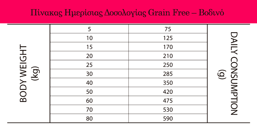 Σύνθεση: βοδινό Angus 28% (18% άλευρο βοδινού Angus, 10% νωπό βοδινό Angus), κοτόπουλο 22%, γεώμηλα 20%, λίπος πουλερικών (διατηρημένο σε μείγμα τοκοφερόλων, πηγή βιταμίνης E) 9%, κίτρινα μπιζέλια 8%, αποξηραμένα μήλα 5%, έλαιο σολομού 3%, συκώτι κοτόπουλου 2%, ζύμη ζυθοποιίας (πηγή μαννoολιγοσακχαριτών), καρότα 1%, γλυκοσαμίνη (300 mg/kg), θειική χονδροϊτίνη (180 mg/kg), εκχύλισμα Yucca schidigera (100 mg/kg), χαμoμήλι (Ματρικαρία το χαμαίμηλον, 80 mg/kg).