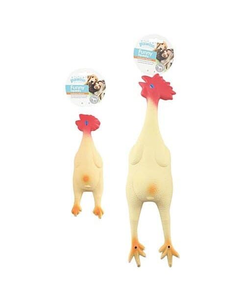 Παιχνίδι από λάτεξ σε σχήμα κοτόπουλου σε δύο μεγέθη 21εκ και 42εκ, ανθεκτικό στα δαγκώματα που θα κρατήσει το μικρό μας φίλο απασχολημένο για αρκετή ώρα. Κάθε σκυλάκι παίζει διαφορετικά οπότε είναι σημαντικό να έχετε το νου σας στο σκυλάκι σας εάν αρχίζει να παίζει πιο άγρια. Έτσι, το παιχνίδι θα έχει μεγαλύτερη διάρκεια ζωής αλλά κυρίως ο μικρός μας φίλος θα είναι ασφαλής. Εάν το παιχνίδι αρχίσει με τον καιρό να φθείρεται προτείνομε να τα απομακρύνετε από το σκυλάκι σας.